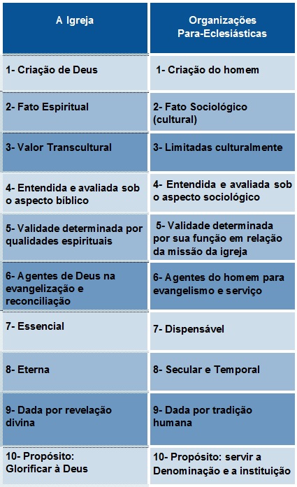 Considerando os aspectos relacionados nas definições igreja “Povo de Deus” e igreja “Comunidade do Espírito Santo” ela difere essencialmente das estruturas Paraeclesiásticas (Denominações, Associações, Organizações Missionárias, Editoras, Seminários, Etc...).